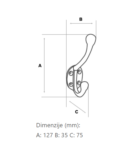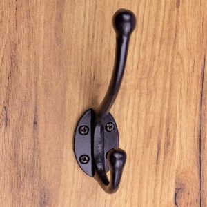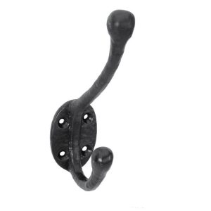 Okrasni kovani obešalnik starinskega dizajna je izdelan iz kakovostnega jekla in pobarvan s črno barvo za dosego starinskega rustikalnega videza.